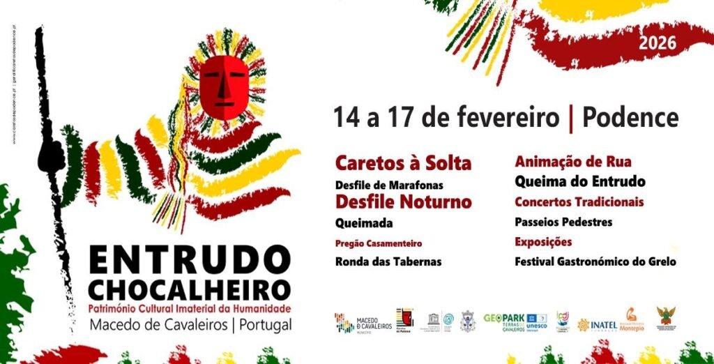 Los Caretos de Podence, reconocidos como Patrimonio Cultural Inmaterial de la Humanidad por la UNESCO, salen a las calles vestidos con trajes de franjas rojas, verdes y amarillas, máscaras expresivas y cinturones llenos de chocalhos. Corren, saltan, hacen ruido y “provocan” en clave festiva, manteniendo vivo un rito ligado a la fertilidad, la renovación y la ruptura de normas antes de la Cuaresma.